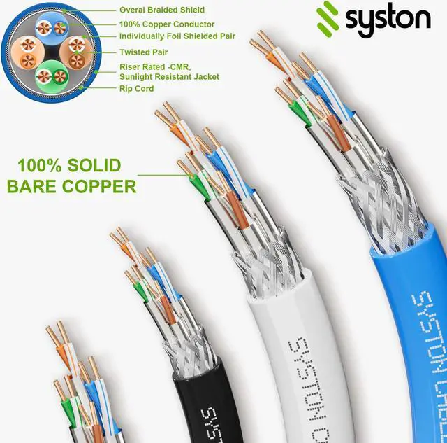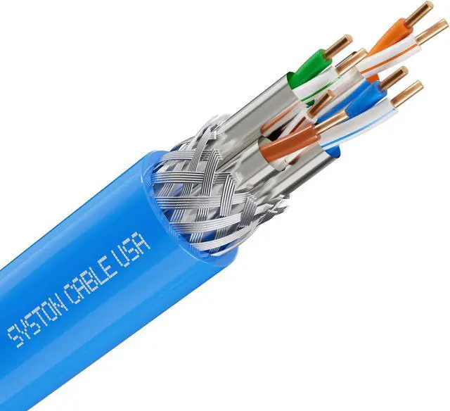 Syston Cable Cat8 Ethernet Bulk Raw Cable 2000MHz 2GHz 40GB 100 ft Solid Bare Copper S/FTP Individual electromagnetic Tinned Copper Braid Shield 22/4 4 Pair 22 AWG CMR FT4 UTP Blue Order to Cut