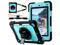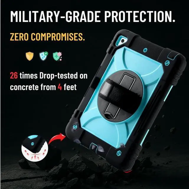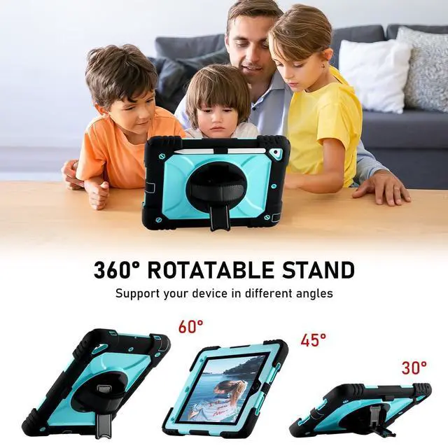 Vteutu Case for iPad 9.7 6th/5th Gen, Air 2, Pro - Rugged Protective Cover with 360° Rotating Stand, Shoulder & Hand Strap, Pencil Holder (Black+Aqua)