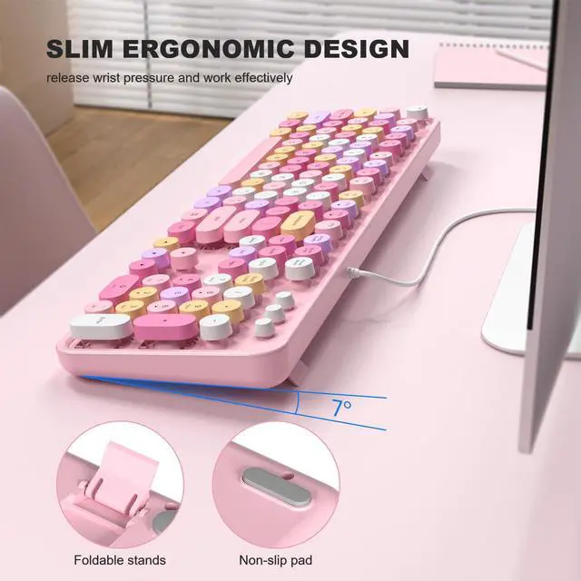 Colorful Retro Typewriter Keyboard: Retro round keycaps merge classic typewriter style with modern tech, adding unique desktop ambiance. Ergonomic foldable stand and anti-slip pads for comfort during long use.