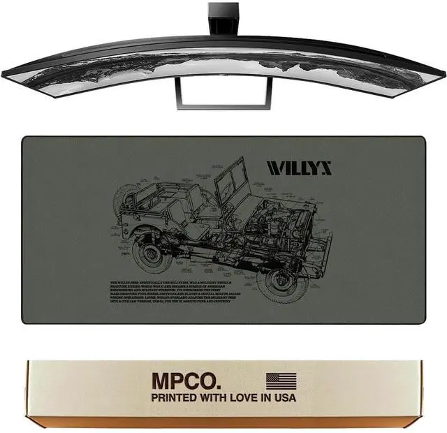 MPCO. Blueprints Large Gaming Desk Pad - 36" x 17" Aeroglyde Fabric Willys Jeep Green Desk Mats - Non-Slip, Washable, Smooth Glide for Precision Gaming & Work