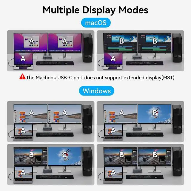 Expand mode: 2 monitors display different images, the computer and 2 monitors can display ABC mode. Please make sure your laptop supports MST and SST to use both display modes properly. Due to system limitations, macOS does not support MST and cannot use the extended display ^^ Fast and Efficient SwitchingThe USB-C KVM Switch Docking Station can control the switching of 2 computers via the Select button on the control panel and an external cable controller (included), keeping your desk tidy, protecting your workspace and providing you with a comfortable working environment. LED indicator will show which source is working, avoiding the trouble of frequent wiring and improving efficiency.