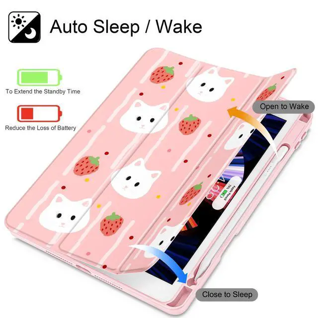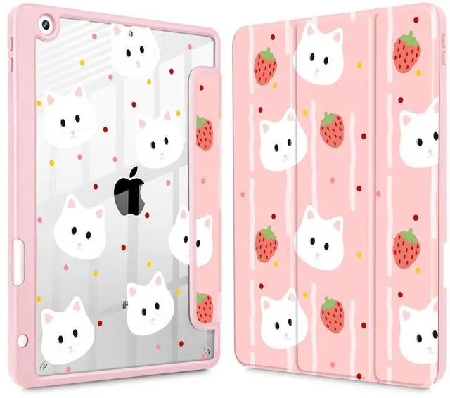 Lepeoac for iPad 9th Generation with Pencil Holder, iPad 8th/7th Gen Case 10.2-inch, [Built in Pencil Holder] Trifold Stand Auto Wake/Sleep Clear TPU Protection Back Cover, Cat Strawberry