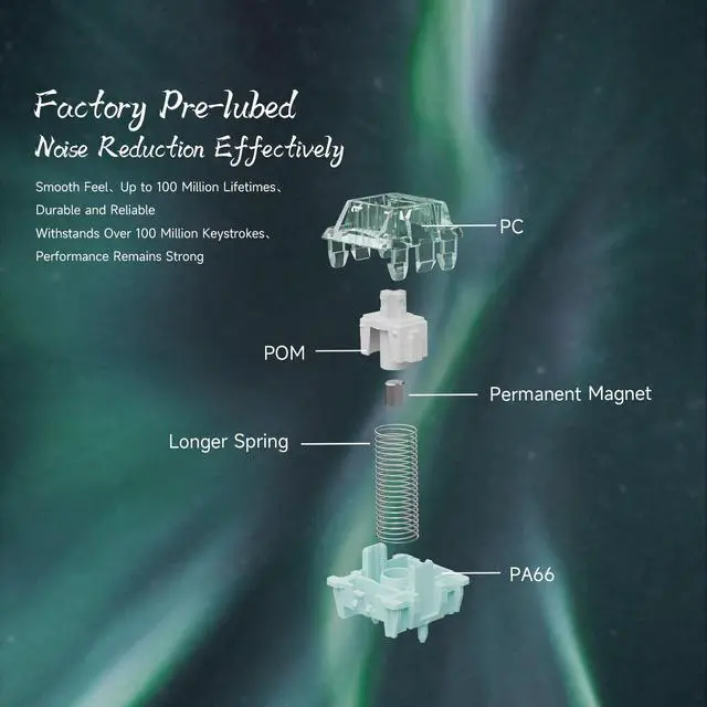 [Keyboard Switches] GATERON Magnetic Jade Pro Keyboard Switches Adopts Rare Earth Permanent Magnet MaterialsIncorporates Special Precious Metal Casting, Featuring Strong Magnetic Remanence. Gateron new created key switches linear switches are special version custom key switches made for DIY enthusiasts to obtain satisfying typing feelings with more affordable options as they wish. No metal leaf, pins, optics or other sensitive hardware that suffers from wear, tear, and particles. This survives the test of times and lasts millions of presses. Broke one? Just swap it out for a new one. ^^ [Intro] This GATERON Magnetic Jade Pro Keyboard Switch is a black technology.