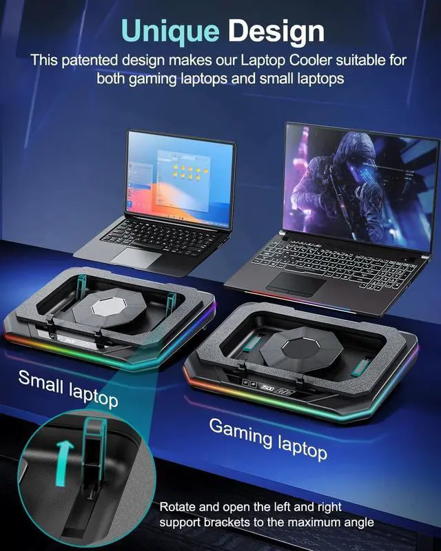 Effective Laptop Cooling: Our cooling pad features a 4.72 -inch large-diameter super powerful turbofan(800-3500 RPM), combined with sealed foam, providing 360-degree surrounding cooling with no air leakage, ensuring an impressive 40 (104) temperature drop (CPU+GPU) in just 90 seconds. Whether you are immersed in intense gaming sessions or tackling demanding tasks, you can enjoy uninterrupted, fast cooling without delays or screen flicker. ^^ Touch Control & HD LED displayFeaturing a visual design, our cooling fan for computer laptop offers real-time fan speed display. The full touch control key allows for easy adjustment of the RGB color modes and fan speed. Fan speed can be controlled independently, freely adjusted Fan speed according to usage conditions((High speed for cooling/low speed for quiet).