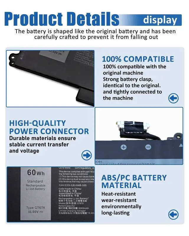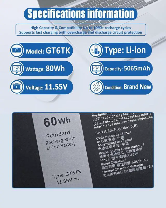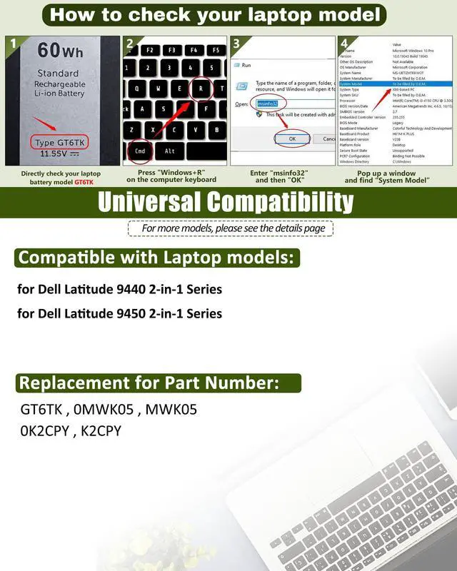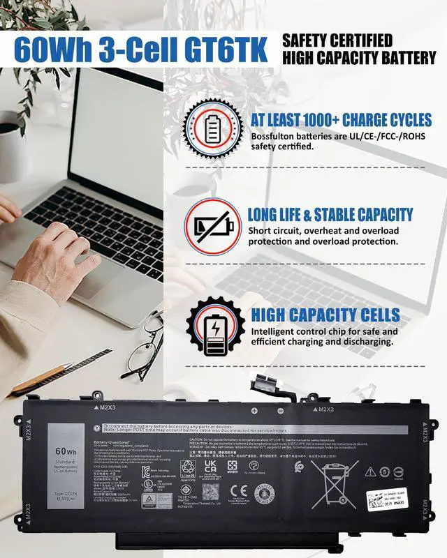 includes: 1x GT6TK Battery, 1 Set x Screwdrivers, 1x Instruction for Laptop Battery ^^ Compatible ModelsReplacement for Dell Latitude 9440 2-in-1 Series; for Dell Latitude 9450 2-in-1 Series ^^ Compatible Part NumberGT6TK 0MWK05 MWK05 0K2CPY K2CPY. ^^ Durable & Safe & ReliableEvery our products replacement battery is engineered for durability, safety, and reliability. Backed by UL, CE, FCC, and RoHS certifications, they meet the highest standards for performance and environmental safety. Our confidence stems from stringent compatibility testing and rigorous quality control throughout production.