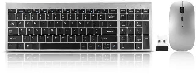 Slim and Ergonomic Design The slim keyboard has a tilt angle for the great typing position. Sweat-resistant, skin-friendly finish wireless mouse in contoured shape would provide hours of work comfortably. ^^ Fast Operation 2.4G Wireless Plug and Play Simply connect both your portable keyboard and mouse with one USB receiver ^^ Less Noise&Profile Keys Typing The keyboard's noise reduced keys and the silent click of the quiet mice will allow you to do your job without missing a sound or disturbing your environment. ^^ Compatible Wireless Keyboard and Mouse Combo The keyboard and mouse combo includes a full-size keyboard and a high sensitivity mouse.