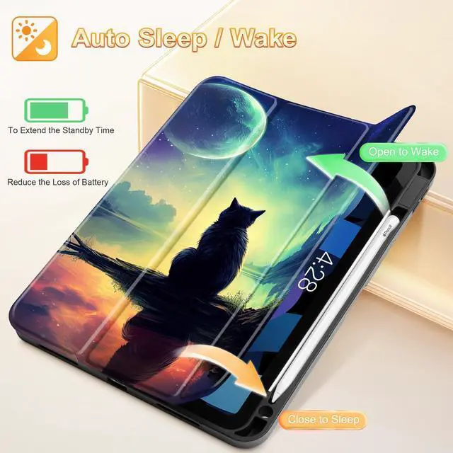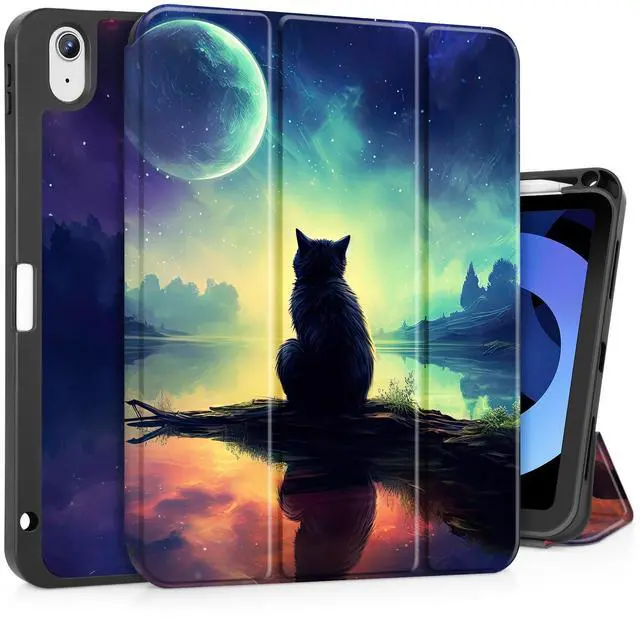 Tuiklol Case for iPad Air 11 inch (M3 2025/M2 2024) 7th/6th Gen/iPad Air 10.9 inch 5th/4th Gen 2022 2020 with Pencil Holder,Slim Protective Auto Sleep/Wake Trifold Stand Tablet Cover,Cat & Moon