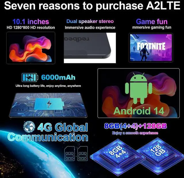 Blazing Fast Android 14 Experience android tablet 10 inch, Experience buttery-smooth gaming and multitasking with the Unisoc 1.6GH z octa-core processor and 8GB RAM. Perfect for running graphic-intensive games, Zoom meetings, and multiple apps simultaneously without lag. The newest Android OS delivers enhanced security and smarter features for work and play. ^^ Never Delete Memories Again Redbeat tablet A2 store thousands of movies, songs, and documents with 128GB built-in storage (expandable to 1TB). The 6000mAh battery provides up to 10 hours of continuous use - binge your favorite shows, power through work presentations, or keep kids entertained on long road trips without worrying about charging.