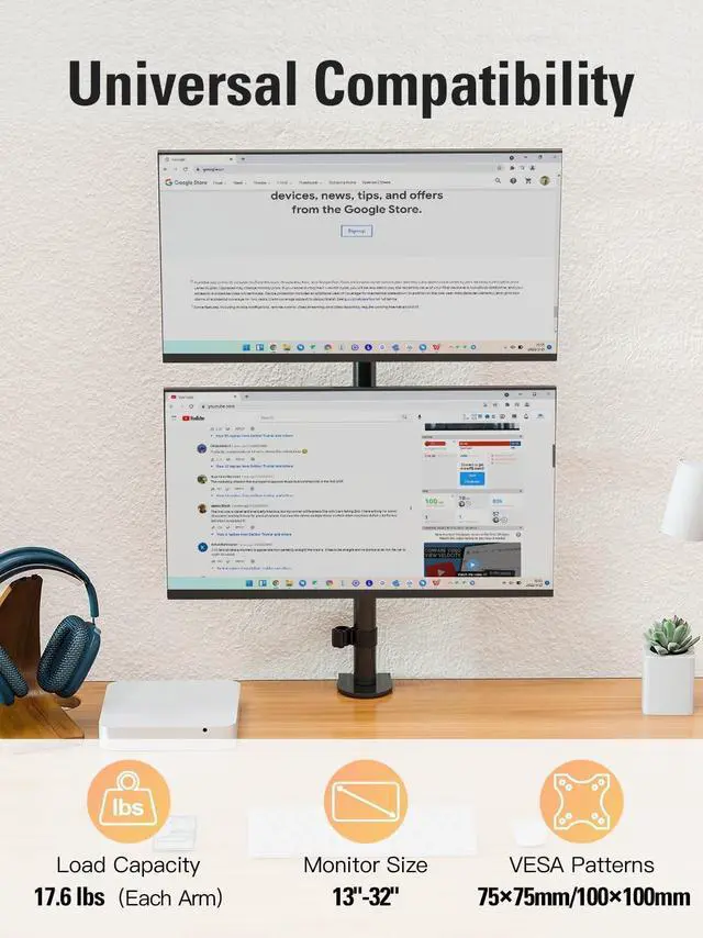 ^^ Wide Compatibility: This vertical monitor stand supports most 13-32 inch screens (up to 17.6 lbs per arm) and is compatible with VESA 75x75mm and 100x100mm patterns for versatile setup options.