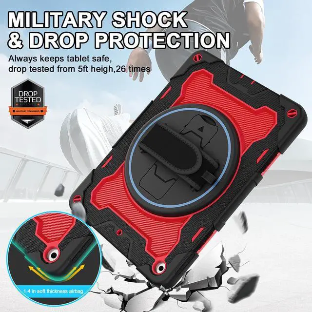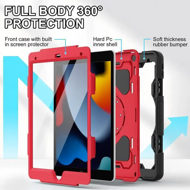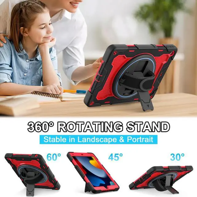 Not only increase ten times shockproof impact resistance, but also increase extra dissipate heat by upgrade built in soft endothermic sponge ^^ [360 Rotating Kickstand / Hand Strap] Multiple angles kickstand and hand strap suit for all kinds of group, such as toddler / children / kids, make money people at office/restaurant / school / warehouse / outside, students at elementary school /middle school/ high school /university, senior people at home, and another people ^^ [Built-in Screen Protector+Detachable Shoulder Strap] Raised edges on the screen protection + have built in screen protector protection, truly made work to protect screen of iPad 9th/8th/7th gen from scratching and breaking.