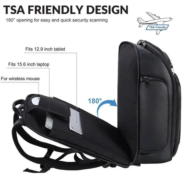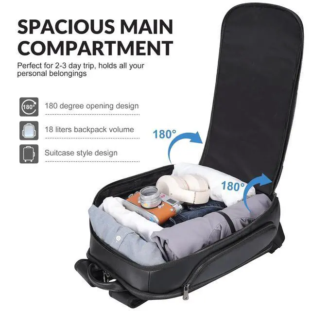 Durable & Water-ResistantMade of 2mm thick real cowhide leather, which is soft and smooth, and water-resistant to light rains. Outfitted with ykk plastic zipper, tear-resistant lining and quality hardware. Each black leather backpack is handcrafted by professional craftsmen with more than 10 years of experience, durable and last for decades. ^^ TSA-Approved & Airline FriendlyThe 180lay-flat design allows you breeze through airport screening and and keep items tidy. It meets the personal carry on standards of airlines, fit for overhead bins and under seats, helping you avoid extra baggage fees.