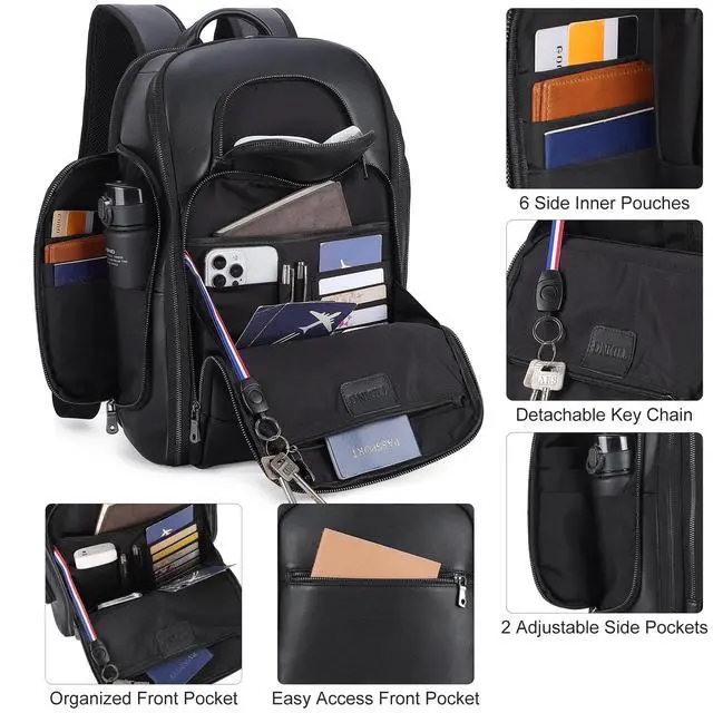 This roomy leather backpack easily install travel supplies for 2-3 days, making it a good choice for weekend vacations and business trips. ^^ Spacious & OrganizedThe main compartment can be freely unfold to 180 degrees for easy storage and access to items. The two side pockets can extend to the main pocket to fit water bottles of different sizes. Thoughtful design with over 20 pockets, including 3 front pockets, 2 main compartments, 2 side pockets, 1 anti-theft back pocket, 12 interior pockets, 6 card slots, 2 pen holders, 1 key chain, 2 padded sleeves for your devices.