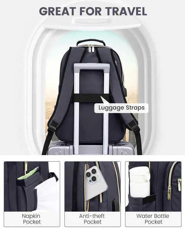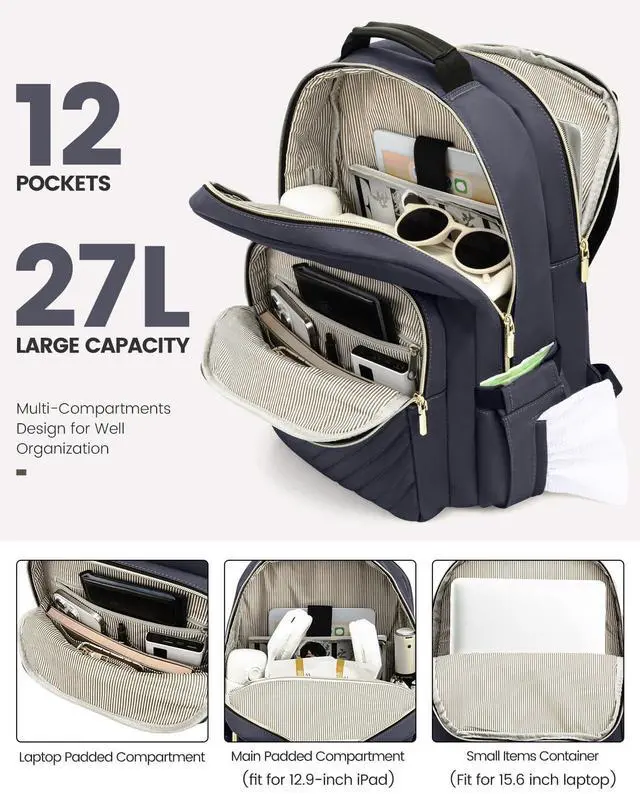 LARGE CAPACITYThis backpack purse looks delicate & stylish, but can hold everything you need on the go. The travel backpack has multiple compartments to hold the laptops, iPads, phones, charger, binders, bottles, umbrellas, magazines, clothes, pens, wallets, and more. ^^ MULTI-COMPARTMENTS & POCKETSThis women's business work backpack is designed with 4 compartments and 17 pockets. Ample pockets keep your travel items organized. ^^ LAPTOP PROTECTIONThe laptop backpack is designed with 15.6 -inch laptop separate compartments and a 11-inch iPad slot; with cushioned cotton sewn around, it maximizes physical protection of your electronic devices.