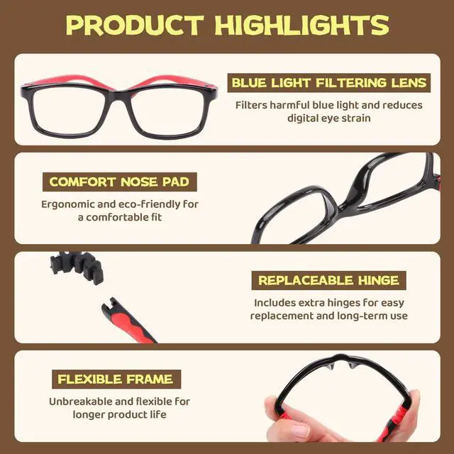 DescriptionMade of flexible TR90 material, these lightweight children's glasses won't hurt little noses even during all-day wear. The 360 bendable hinges survive rough handling, while the anti-slip elastic strap keeps them secure during sports. Choose from 2 fashionable colors with optimized frame curves for 2-15 year olds - includes a protective hard case perfect for school or travel.