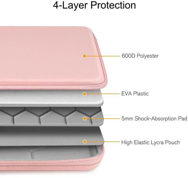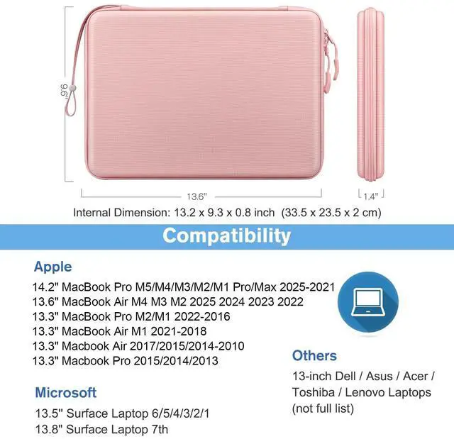 Wide CompatibilityInternal Dimension: 13.19 x 9.25 x 0.79 inches, compatible with 13.6" MacBook Air M4 A3240 M3 A3113 M2 A2681 (2025 2024 2023 2022), 14" MacBook Pro M5/M4/M3/M2/M1 A3434 A3401 A3185 A2918 A2992 A2779 A2442 Pro/Max (2025-2021), 13.3" MacBook Air M1 A2337 A2179 A1932, 13.3" MacBook Pro M2 M1/A2338 A2251 A2289 A2159 A1989 A1706 A1708, 13-inch iPad Pro M4 / iPad Air M2 2024, 12.9 '' iPad Pro 6th/5th/4th/3rd Gen, Compatible with Microsoft Surface Laptop 13", Surface Pro 12", Surface Laptop 13.8 '' 7 2025 13.5 '' 6/5/4/3/2/1, 13.5" Surface Book 3/2/1, Dell XPS 13, and other tablets up to 13". ^^ Shockproof Laptop SleeveThe MacBook Air/Pro sleeve is consists of a semi-hard EVA shell with anti-scratching polyester to protect your laptops from external shock, scratches, dust and bumps. ^^ Superior Protective SleeveThis laptop sleeve equips with 5mm thick padding, provides your computer/tablet with 360 all-around protection, premium & durable YKK zippers for secure and long-lasting usage. ^^ Water-resistant Laptop CaseThe outer fabric of the laptop carrying case is made from 1600D High-Density Polyester, which provides better water-repellency and wear-resistance than normal nylon.