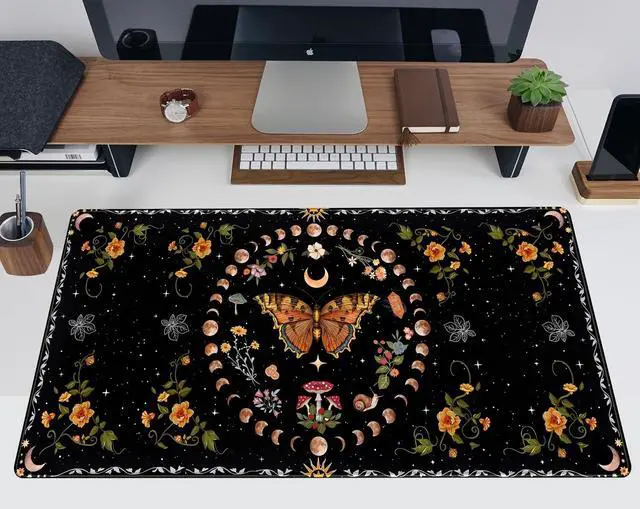 Moth Desk Pad Mushroom Phase Moon Phase Desk Mat, Boho Flowers and Leaves Computer Big Mouse Pad Washable Cloth Non-Slip Rubber Base Keyboard Pad Mouse Mat for Office with Stitched Eges 31.5x15.7 in