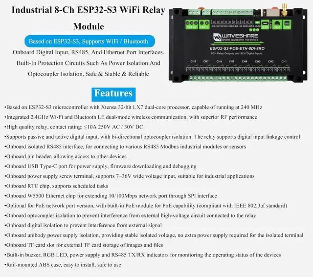 ^^ Digital Input: 8 Input channels. Supports passive (dry contact) and active (wet contact) digital input, with bi-directional optocoupler isolation. 5V~36V Input voltage. ^^ Extension