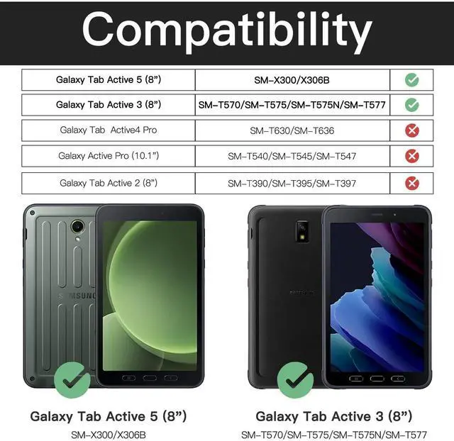 CompatibilityDesigned for Galaxy Tab Active 5 - 8 inch 2024 [SM-X306B/X300]& Galaxy Tab Active 3 -8 inch 2020 [SM-T540/ SM-T545/ SM-T547]Tablet Case, WILL NOT FIT ANY OTHER TABLETS; Provide A Safe Storage Holder for S PEN ( S Pen and Screen Protectorsis NOT included) ^^ Rugged ProtectionThis Galaxy Tab Active 5/Tab Active 3 case is made of premium hard plastic and soft shock-absorbing silicone. Advanced 3 in 1 structure design provides the better protection from scratches, drops and impacts. Precise cutout design, easy to access all features without removing case. ^^ 360 Rotating stand&