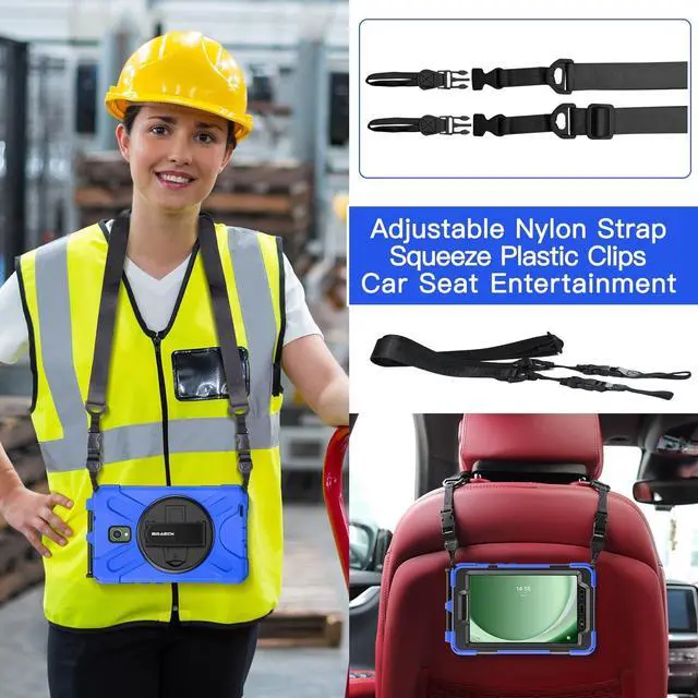Hand Strap: Located on the back of Galaxy Tab Active3 8 inch heavy duty cases, built-in 360 degree rotating kickstand and adjustable handle hand strap provides a more flexible and convenient way to use your tablet during work, study or journey, ideal for students, teachers, engineers, cashiers and waiters, etc. ^^ Adjustable shoulder strap You can remove or adjust the strap to a comfortable length, then this Galaxy Tab Active5/Active3 tablet can be carried in a landscape/portrait modes more securely during hiking, traveling or other outdoor activities. Also, the strap allows to hang up your tablet behind car seat for entertainment for kids to kill free time or keep quiet. ^^ Customer ProblemOur professional service team is here to help you solve your problems. Please contact us via email with any questions.