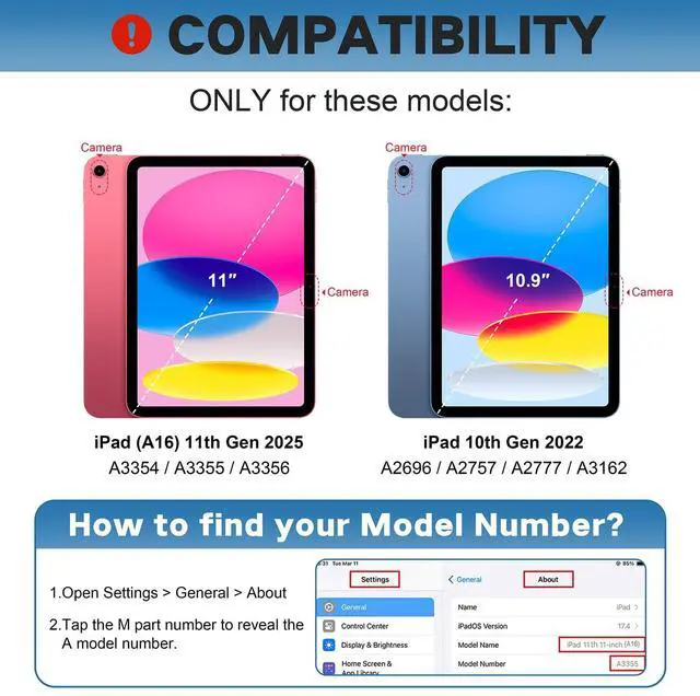 Type: Specially designed for New iPad (A16) 11th/10th Generation 11& 10.9 inch, Please check the model number of your tablet again before your purchase.