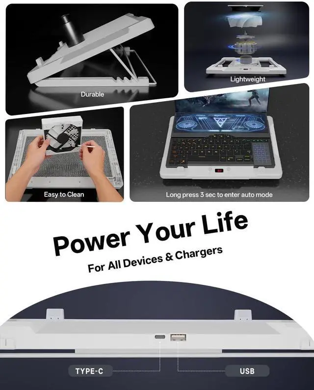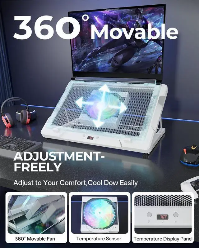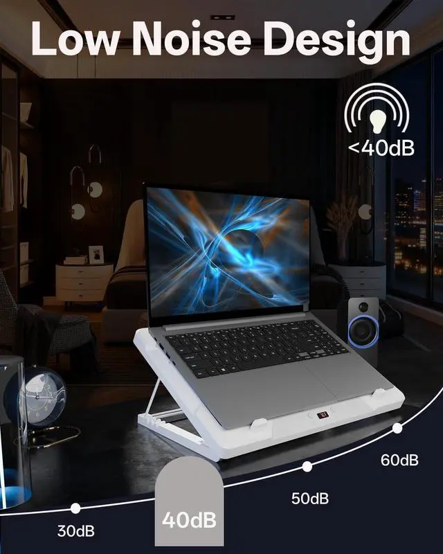 ULTRA QUIET OPERATION 40DB: The laptop cooling stand designed to stay whisper-quiet even under full load. Operates at 40dB, ideal for late-night work, studying, or streaming without distraction