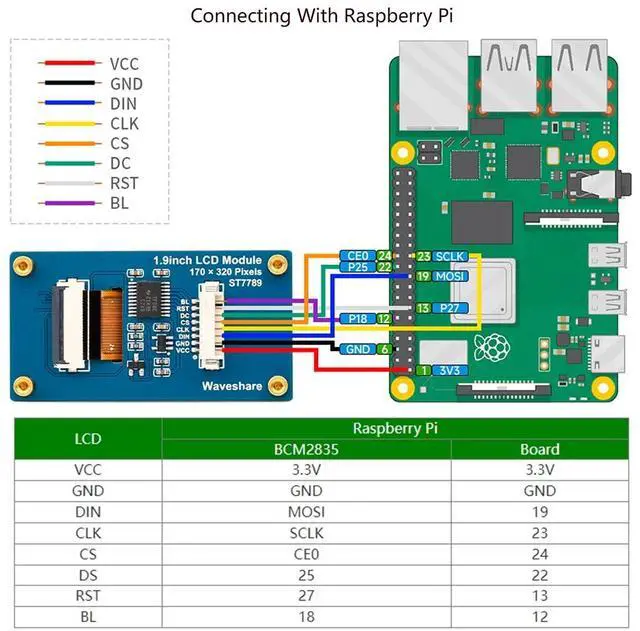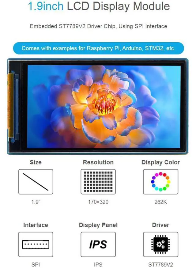 This is Waveshare 1.9 inch LCD Display Module 170320 Resolution, IPS, 262K Colors, Embedded ST7789V2 driver chip, Using SPI InterfaceFeatures170320 resolution, 262K colors, clear and colorful displaying effectSPI interface, minimizes required IO pins, supports controller boards, compatible with Raspberry Pi/ withArduino/STM32. Comes with online development resources (examples for Raspberry Pi/Arduino/STM32), Please