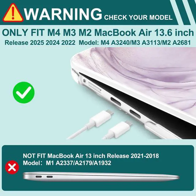 Compatible With - Only for M4/M3/M2 MacBook Air 13.6 Inch 2025 2024 2023 2022 (Only compatible model: A3240/A3113/A2681). Please confirm the model on the bottom of the MacBook before ordering ^^ Durable Material - MacBook Air 13.6 -inch case is made of hard PC material, effective anti-slip/shockproof/anti-scratch etc ^^ Case Design - The case adopts the top and bottom case separation design, easy to install and remove ^^ Case Port Design - Precise cutouts allow full access to all ports, features, buttons, and Touch ID functionality ^^ Package - Included 1 MacBook Air 13.6 inch Case, 1 Keyboard Cover, 1 Trackpad Protector, 2 OTG Adapter