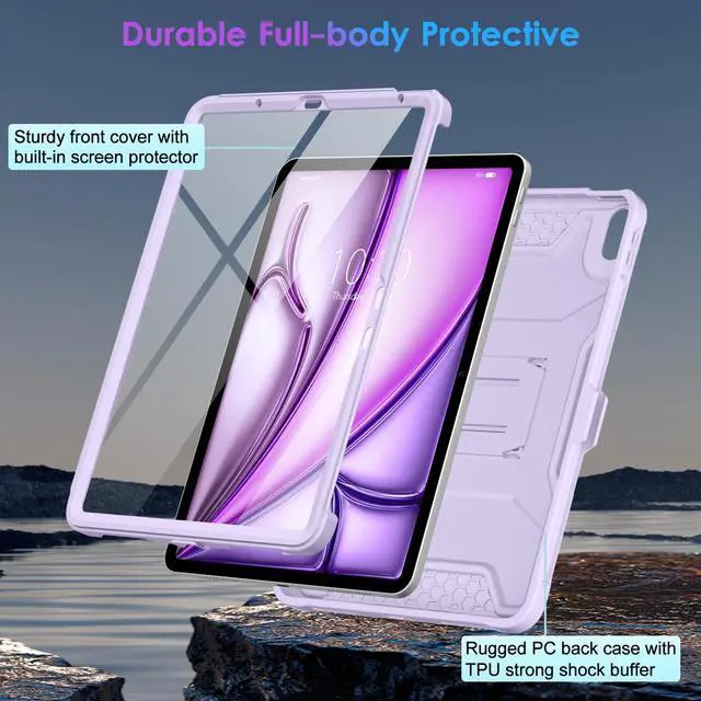 (Note: Pencil is Not included) ^^ [Functional Kickstand] Bulit-in kickstand provides two stand angles and allows easy access to your favorite video viewing, e-reading, writing or drawing, web browsing and video conferencing ^^ [Precise Cutouts] All ports(sensors, speakers, cameras, volume keys. )have precise openings, while the dust-proof charging port effectively prevents foreign matter from clogging ^^ [Shock-proof Protection & Slim] Dual-layer design (only 240g) with hard PC back and durable TPU frame-Delivers full-body drop protection without adding unnecessary bulk, perfect for outdoor person or kids, daily commuting and travel