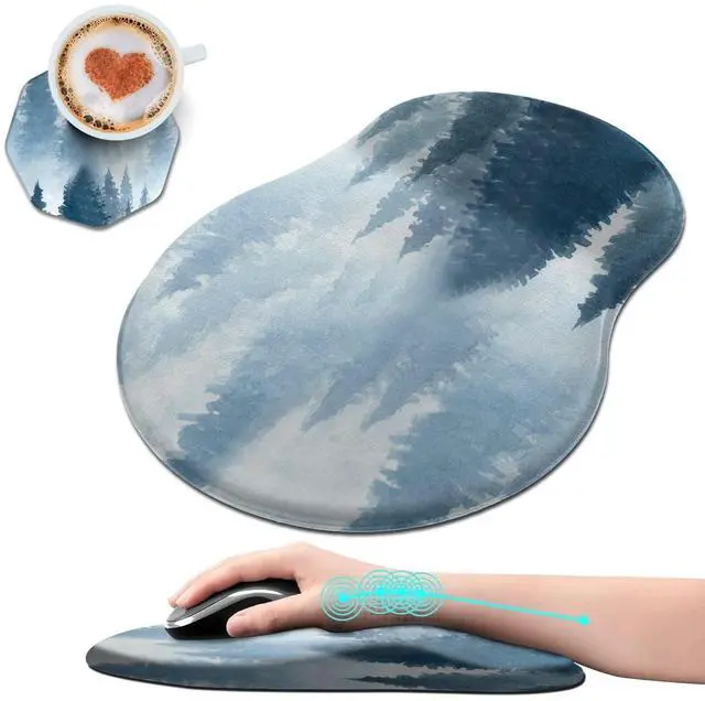 Unique Shape and Size-- 13x 8.66 x 0.86 inches; Coffee Coaster 4" x 4" x 0.08" mouse wrist rest pad fits all types of mouse, wired, wireless, mechanical, laser & optical. The reinforced edges of mousepad prevent deformation and damage to guarantee long term use. High quality materials-- This mouse pad is made of memory foam with no additives or fillers. And the cover is made of soft and smooth fabric, no irritation to skin, is able to track the mouse movements fast and accurate. Not easy to curl up on the edges even after long time usage.