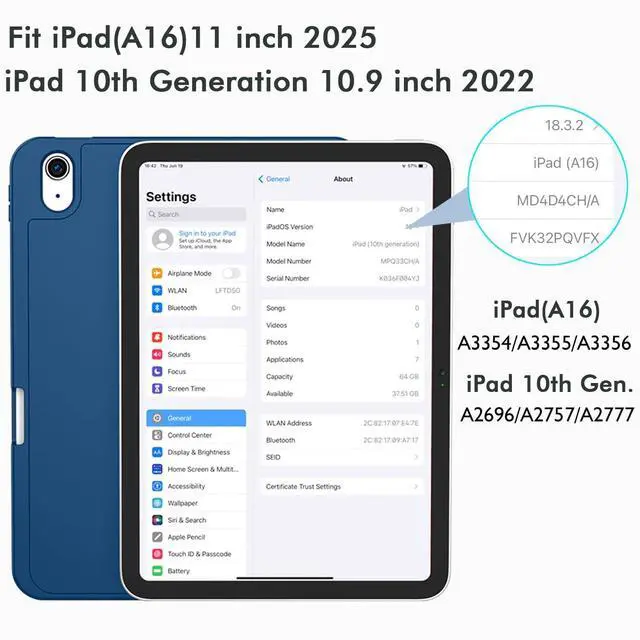 • Designed for iPad (A16) 11-inch 2025 (Model: A3354, A3355, A3356),iPad 10th generation 10.9-inch 2022 (Model: A2696, A2757, A2777). Note: It will not be compatible other model. Please check your iPad model before purchase.