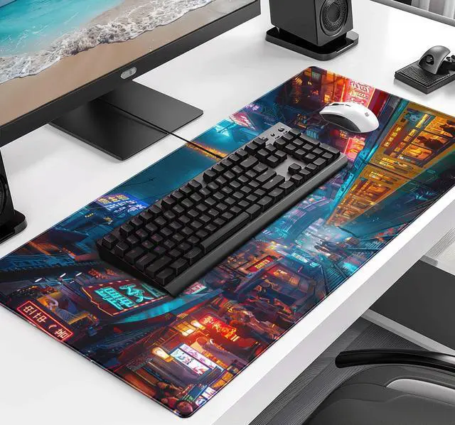 Japanese Anime Retro City Night Scene Mouse Pad, Non Slip Base and Stitched Edge Design, Suitable for Office and Home Desktops, Size 35.4 x 15.7 Inches