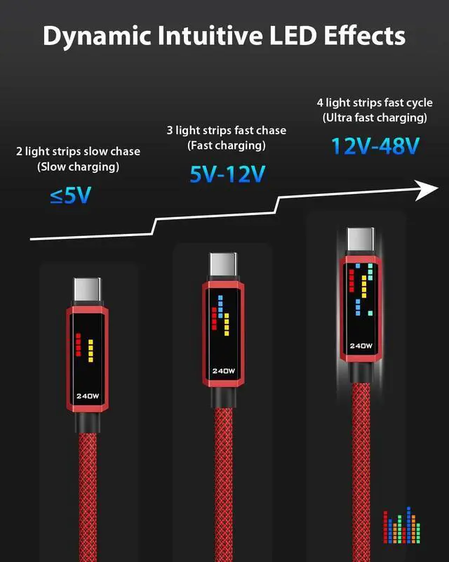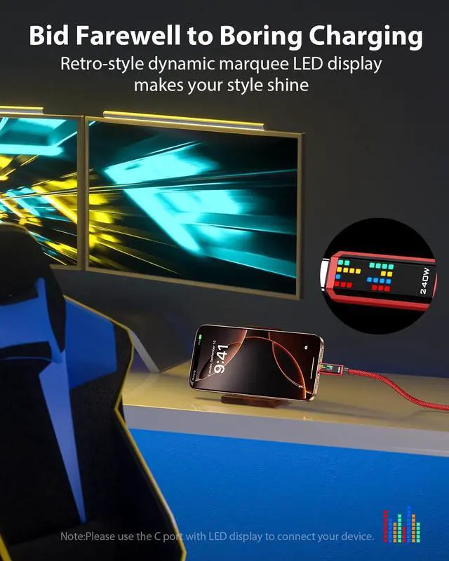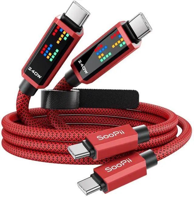 (Note: This is a USB 2.0 charging and data - transfer cable; video output is not supported. ) ^^ Eye-Catching Retro Dynamic LED Display The SooPii USB C cables LED display shows classic pixel animations while indicating Fast/Standard charging. When connected to both the power source and device, pixels fill the screen to confirm connection, followed by a slow chaseonce your device is primed for fast charging, the pixels shift to continuous rapid cycle, making it easy to visually confirm active PD fast charging status. No live power metrics just simple, intuitive, and visually striking retro vibes. (LED details & more in Q&A. ) ^^ Premium Durability & Safety Charge This strong nylon braided USB-C data cable build resists tangles and withstands 45, 000 bends, with sturdy aluminum alloy connectors, ensuring reliable power delivery. The built-in E-Mark chip supports up to 240W fast charging and enhances safety by regulating current/voltage to help reduce risks of overheating, overvoltage, and battery damagemaintaining optimal charging temperatures. Perfect for travel, daily commutes, or home use. ^^ Wide Compatibility This 240W USB C to USB C charging cable supports devices up to 240W (140W, 100W, 65W, 60W, 45W, 20W).