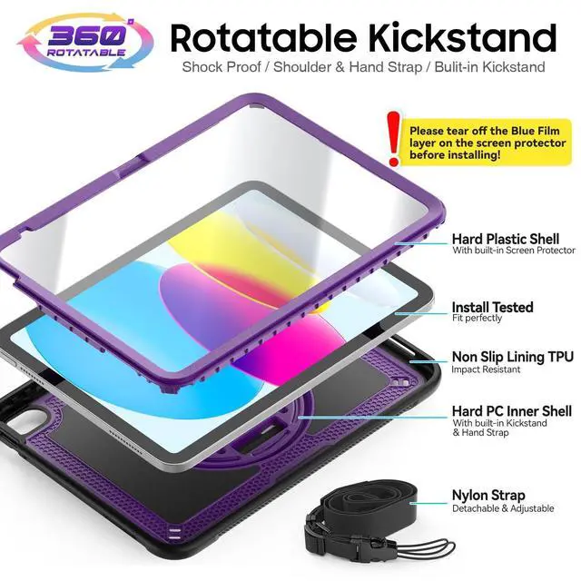 [Compatibility] Protective Case for iPad (A16) 11 inch 2025, for iPad 11th Generation 2025, for iPad 10th Generation 10.9 inch 2022, Model: A3354 / A3355 / A3356 / A2696 / A2757 / A2777; Please confirm the model number before purchase this case for iPad ^^ [Full-Body Protection + Screen protector] Combine soft TPE outer with hard inner, case for iPad 11 inch A16 with screen protector, provide full body protection for iPad 11/ 10th Generation from scuffs and impacts, suited for outdoor ^^ [Versatility Stand + Adjustable Hand Strap] With 360 rotating adjustable kickstand stable at multi-angles, case for iPad A16 11 inch 2025 for viewing, typing; Case for iPad A16 2025 with Loop Nylon Hand Strap that allows hold device comfortably in one hand for presentations, navigation, document scanning, suited for classes/meetings ^^ [Adjustable Shoulder Strap] Portable, Detachable shoulder strap of Case for iPad 11 inch, for a wide-range of users, carry your device by side and hands-free at all times, case for iPad A 16 11inch suited for business/travel ^^ [SERVICES] SEYMAC Stock case for iPad A16 11 inch/ 10th Generation 10.9 '' offers 6 months maintenance or replacement service for product defects. If you encounter any problems or concerns during use, such as size mismatch, installation guide, return or exchange, product damage, etc, please let us know immediately and we will help you solve the problem within 24 hours