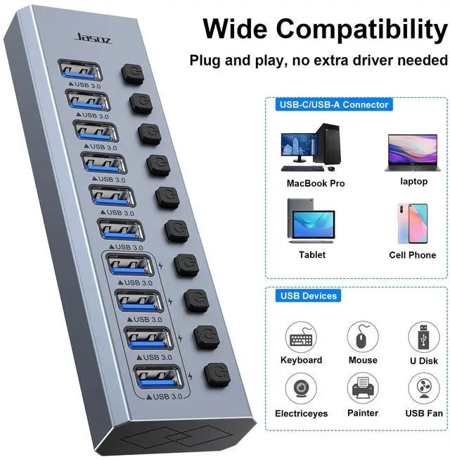 Powered USB Hub: 10-port powered USB 3.0 -A hub instantly adds 5Gbps USB-A 3.0 ports and 4 USB-A smart charging ports to your laptop, desktop, gaming console, etc. Fully plug-and-play, no drivers required ^^ Smart