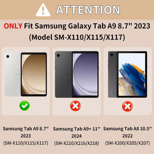 Precise FitExclusively designed for Newest Samsung Galaxy Tab A9 8.7 Inch (SM-X110/X115/X117, 2023 Released) ONLY. Please kindly check the model number SM-X*** at the Settings of the tablet before purchase.