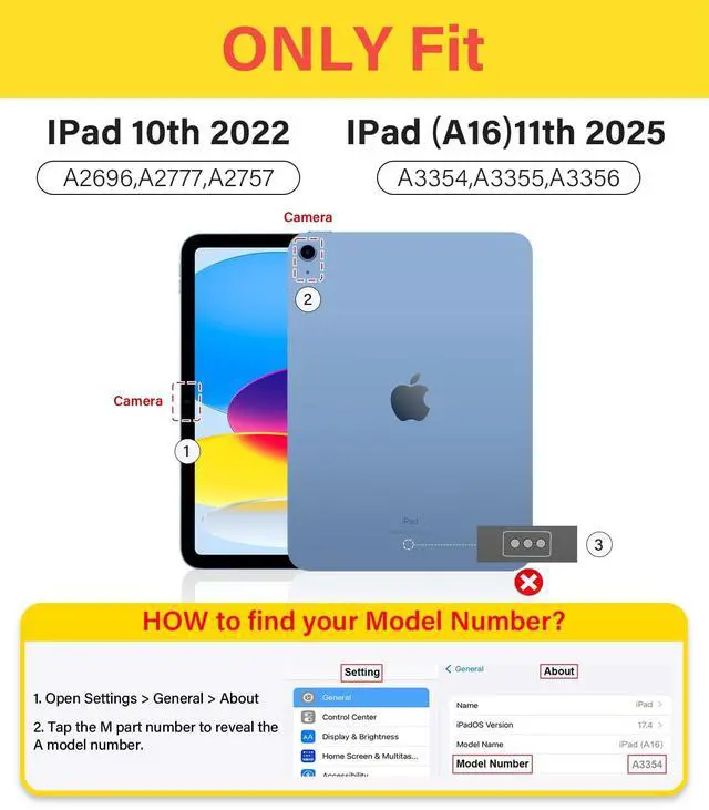 • Perfect Fit: iPad (A16)11th/10th Gen Onlyfor: iPad (A16)11th Gen 11-inch (2025): Models A3354/A3355/A3356 and iPad 10th Generation 10.9-inch (2022): Models A2696/A2757/A2777. Confirm back "A" number before choosing this case to protect your investment.