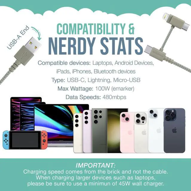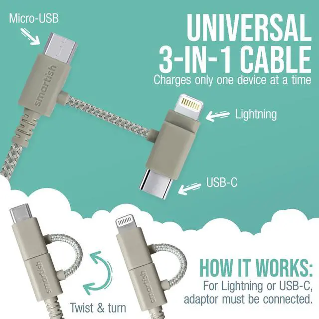 -- - [Micro-USB, USB-C, & Lightning] Flexible, fabulous, and fast-charging ^^ Fabric-wrapped freshness means fewer tangles ^^,! Faster than you can say "1% remaining" ^^ No commitment issues here ^^ N T Apple MFi certified & plays well with nearly every device