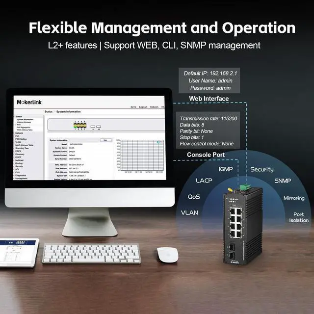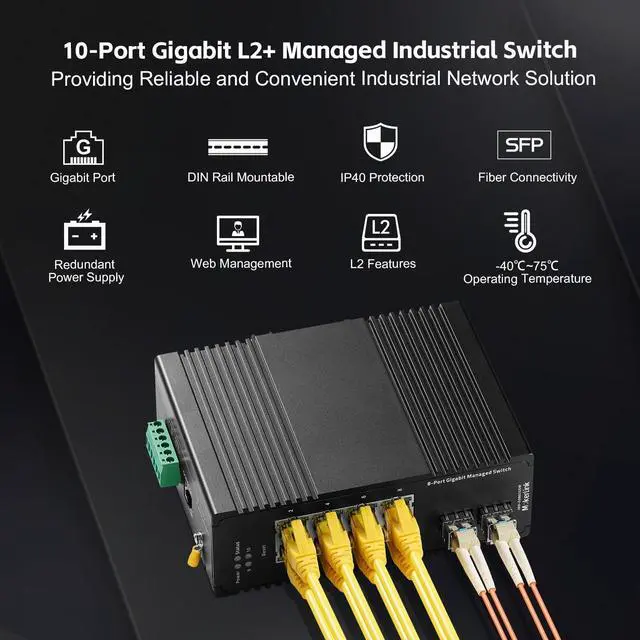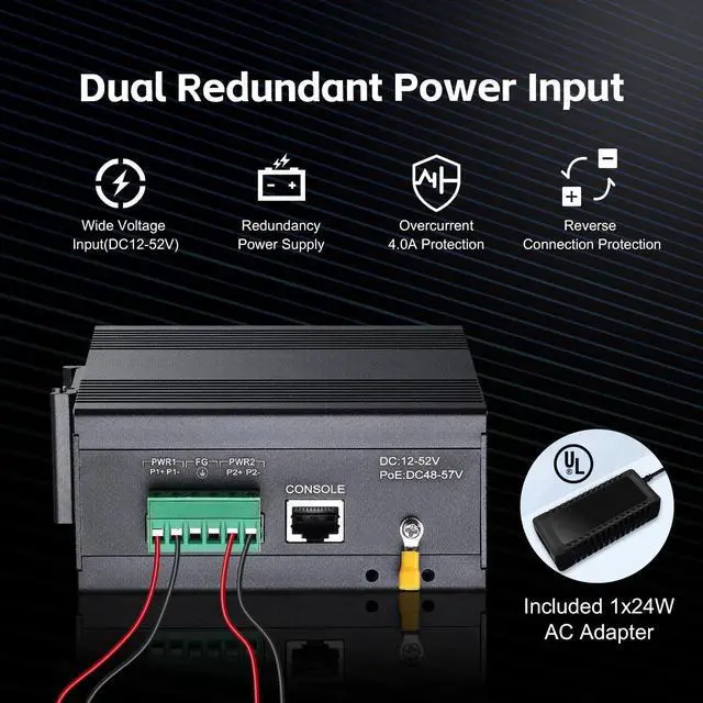 This network switch include 8 gigabit ethernet ports, 2 gigabit SFP, switching capacity up to 20bps. Support automatic detection, full/half duplex MDI/MDI-X adaptive. ^^ Easy-to-use web management interface, with rich L2+ functions, including 4K Vlan, 8K mac table, Qos, port security, speed control; IGMP; storm suppression; ring network, loop protection; etc. ^^ The shell is made of industrial-grade aluminum alloy, which is more sturdy, surface groove design, better heat dissipation, integrated DIN-rail/wall mount kit, installation and disassembly are very simple ^^ IP40 protection grade, working temperature -40~75C(-40~185F), super robustness, anti-lightning, anti-static and anti-overload protection, adapt to various harsh environments ^^ Dual power supply, automatic fault switching, anti-reverse connection does not damage the equipment, higher reliability, equipped with one UL-certified power adapter, can be used without additional purchase.