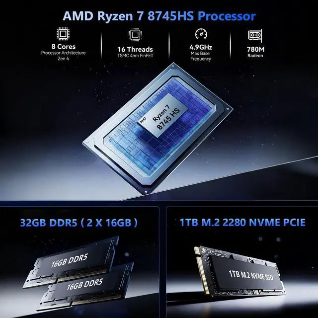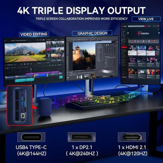 All-in-One Gaming Mini PC with Built-In Dual Stereo SpeakersThe SOAYAN EXR1 mini PC features internal stereo speakers that deliver rich, clear sound for an immersive audio experience for gaming, video editing, video conferences and music without needing a headset or external speakers. The space-saving cylindrical design maximizes your desk space. The RGB breathing light on top of the micro PC adds a futuristic, personalized touch to enhance your entertainment and productivity ^^ AMD Ryzen 7 8745HS & HDMI 2.1 +DP 2.1 +USB4 Triple DisplayEquipped with AMD Ryzen 7 8745HS processor (8C/16T up to 4.9GH z), the mini pc amd comes with AMD Radeon 780M Graphics (12 cores, 2600MHz), allowing triple display output with HDMI 2.1, DP 2.1, USB4 Type-C ports and supports ultra-realistic 4K visual effects.