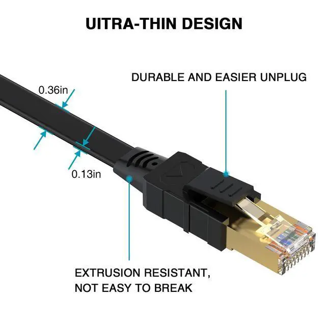 This high-speed Cat8 Ethernet cable is ideal for networking and gaming applications requiring maximum bandwidth. At 75 feet in length, it provides plenty of reach throughout your home or small office while still delivering ultra-fast speeds of up to 40Gbps. The gold-plated RJ45 connectors ensure a secure and reliable connection every time. Constructed with extra-thick 4mm2 conductors inside a flexible black jacket, this cable supports bandwidths up to 2000MHz and is fully compatible with Cat5e, Cat6, and Cat7 networks. Its flat profile makes it easy to run along baseboards or around corners without bulking up your wiring closet or home theater setup.