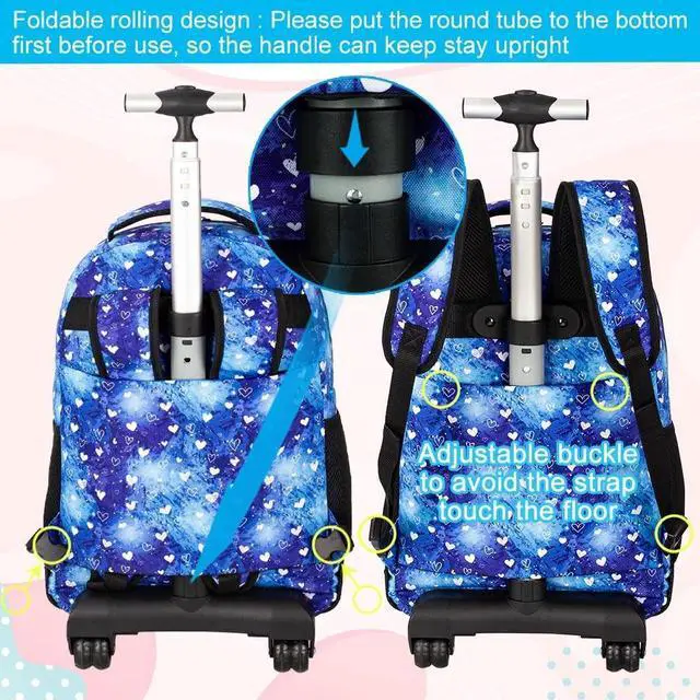 ^^ Dual-use Style Design: The girls rolling backpack base can be fixed for easy dragging, not used can be put away, you can use as a rolling bookbag or backpack according to different use scene. ^^ Large Capacity Rolling Backpack for