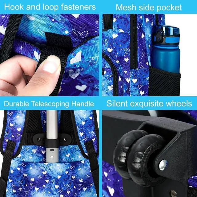 Rolling Backpacks Set: 3-in-1 design, rolling backpack for girls (19"x13"x8"Inche) + lunch box (10"x10"x3"Inche)+ penil bag, reasonable combination to meet the needs of girls of different ages.