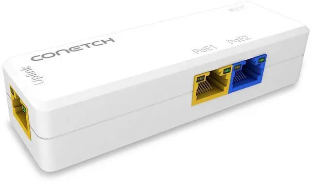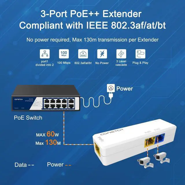 PoE Extender: This PoE extender 1 PoE in 2 PoE Out Design, It can provides PoE power to 2 PoE devices, 10/100Mbps speed, Extend your network with a transmission distance of up to 426ft (130m) ^^ IEEE 802.3 af/at and
