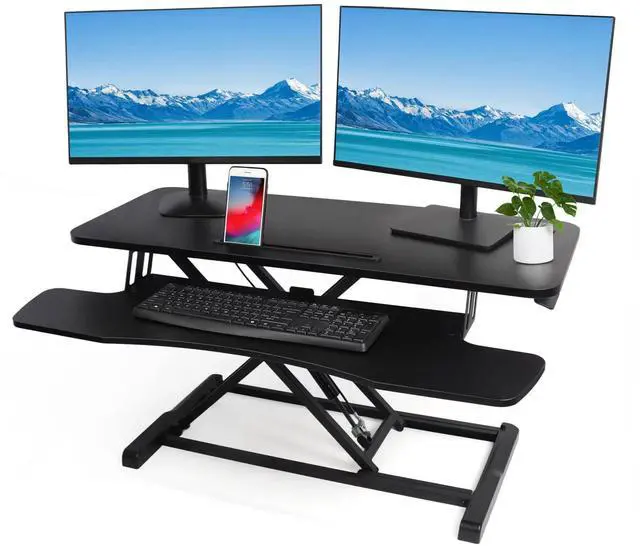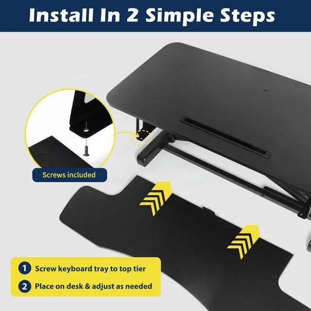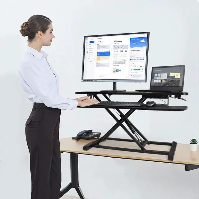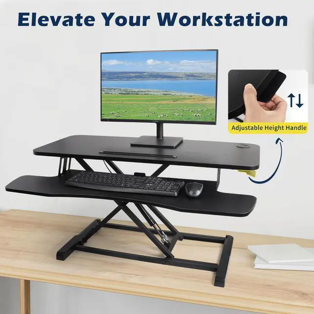 "Redefine Your Work Experience" Engineered to enhance both productivity and physical comfort, this height-adjustable workstation integrates perfectly with your current desk setup. Its intelligent sit-stand design delivers ergonomic benefits whether you're in corporate offices or home workspaces - all at a fraction of traditional standing desk costs. ^^ "Optimized Workspace Architecture" Featuring a 31.5" x 15.75" reinforced desktop that accommodates dual 27" monitors or laptop+display configurations. The synchronized keyboard tray maintains proper UL/DIN ergonomic alignment during height transitions, with 28.6 lb load-bearing capacity for full workstation setups. ^^ "Effortless Up & Down Movement" Glide between sitting and standing with our gas-spring lift system (adjusts 4.3" to 19.7" )