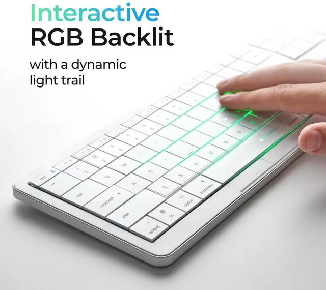 ^^ INTERACTIVE RGB BACKLIT: Customize your gesture-responsive RGB backlight with 16.5 million colors with the App. ^^ TOUCHONKEYS APP. Setup backlit effects, add content-aware profiles, customise gestures and touch sliders, update firmware, and chat with support. ^^ BATTERY LIFE. Up to 40 hours of uninterrupted work (without backlight) around 1.5 weeks of normal usage. Up to 12 hours with per-key RGB backlight on.