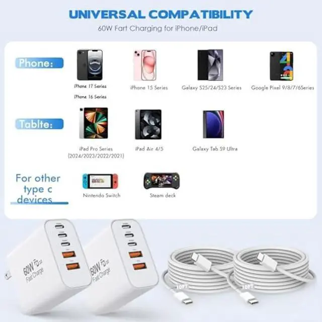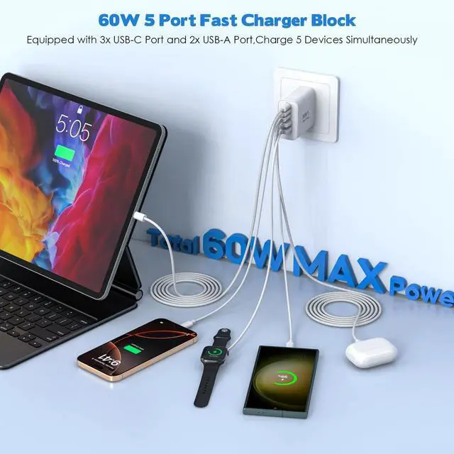 Charger Brick: -Three USB C Ports and Dual USB A Port in One Charger. -Tired of managing multiple chargers? Charge your iPhone, iPad and AirPods simultaneously with just one USB plug ----- no more cluttered interfaces. -The type C charger block power delivery port achieves up to 3x faster charging for new iPhone 17/16/15 series and older iPhones (compared to the 5W adapter), -Charge your iPhone 16 15 Pro Max up to 65% in just 30mins. 2 Pack 3M USB C to USB C Braided Cords (woven material has a longer service life): -Supports 480Mbps data synchronization transfer, transfer videos, music and more between your phone and laptop in seconds. -10Foot Fast Charging Cable is a convenient choice. It combines practicality with efficiency, providing the extra length needed for various charging scenarios.