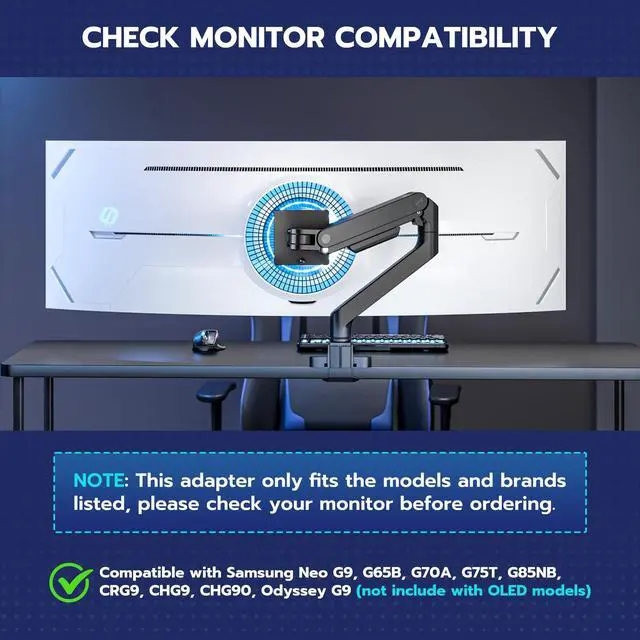 • Quick Adapter Solution for Samsung MonitorsARES WING monitor arm & VESA adapter bundle is tailored specifically for Samsung monitor models include: Neo G9, G65B, G70A, G75T, G85NB, CRG9, CHG9, CHG90, and Odyssey G9 (Incompatible with OLED models). Before making your purchase, please double-check that your monitor model is compatible with this adapter.