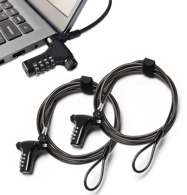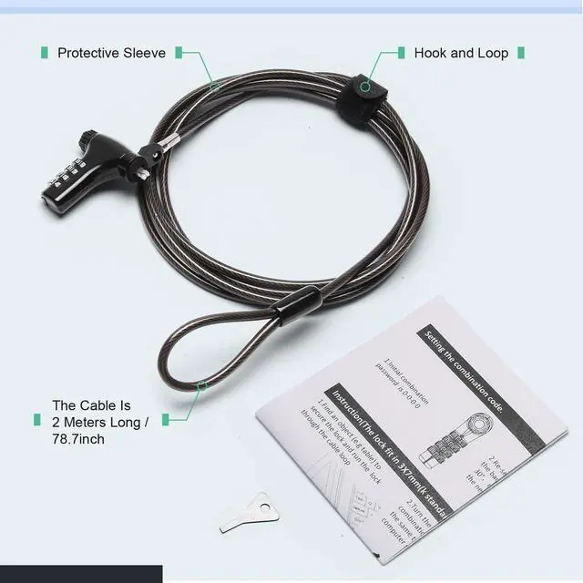 Combinations & Fully Re-settable Code]: Resettable 4-digit combination lock with 10, 000 possible combinations. Easy flick switch to lock and unlock for fast setup. ^^ [Robust Alloy Lock Body & Cut-Resistant Steel Cable]: The lock head is made of zinc alloy, which is rust-free and durable. The cable length is 2M/ 6.7 f, the steel core diameter is 3.0 mm, multiple steel cores are wound together to form one, with a PVC leather sheath on the surface, which has strong cutting resistance. It effectively deters opportunistic theft, giving you peace of mind when leaving your laptop in libraries, coffee shops, or open offices.