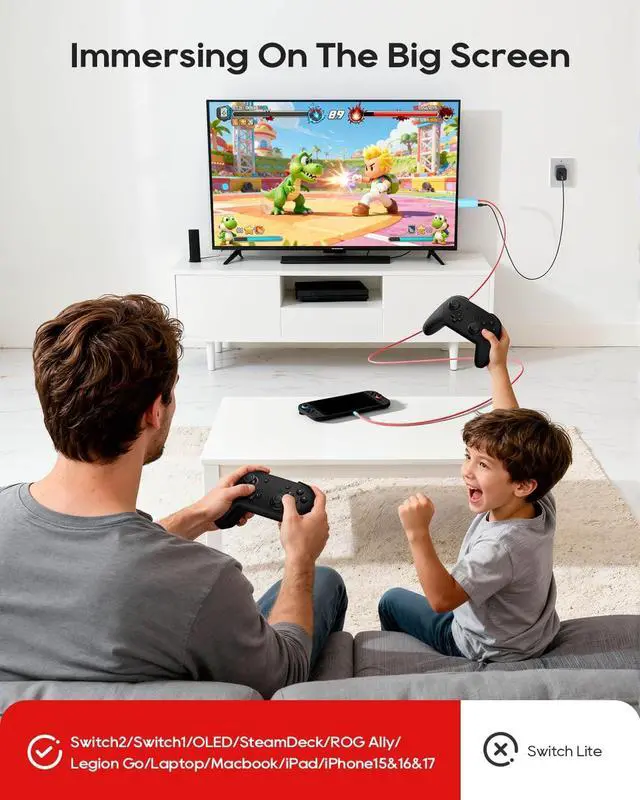 ^^ Universal Compatibility: Your Go-To Dock for Multiple DevicesThis versatile Switch 2 dock for Nintendo systems and Steam Deck dock supports the full NS series (Switch 2/1/OLED), Steam Deck, ROG Ally, Legion Go, and more. It also works with iPad Pro/Air, iPhone 15/16/17, and USB-C 3.2 laptops. Plug-and-play readyno drivers neededfor instant connection to TVs, monitors, and projectors. ^^ True Plug-and-Play Simplicity No Extra Dock RequiredEnjoy instant setup with this streamlined USB-C to HDMI solution. Theres no need for an extra dock or complicated installation. Just plug it in, and within seconds, your screen becomes a dedicated gaming displaymaking it the most user-friendly portable dock and HDMI adapter for gamers who value convenience and performance.