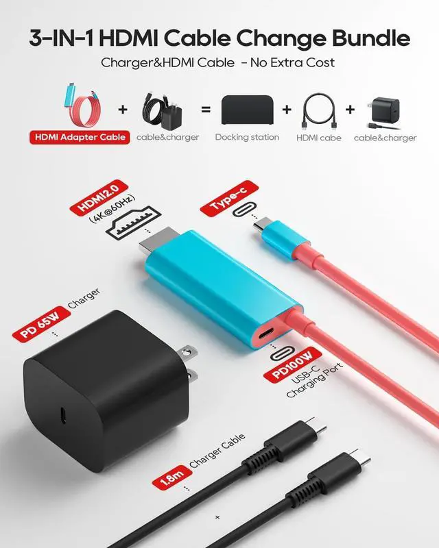 The Ultimate Portable & Travel Dock for Switch 2/1/OLED & Steam DeckSay goodbye to bulky setups. This all-in-one HDMI cable is the perfect portable dock and travel dock that replaces the original dock with a sleek 2-meter design. Weighing just a fraction of the original, it delivers the same high-quality performanceideal for big-screen gaming on the go, whether youre traveling, in a dorm, or at a friends place. ^^ Full 65W Charging Kit Included Your All-in-One Power & HDMI AdapterNever worry about power while you play. We include a complete 65W power adapter and AC adapter, making it the ultimate charger for Switch 2/1/OLED & Steam Deck.